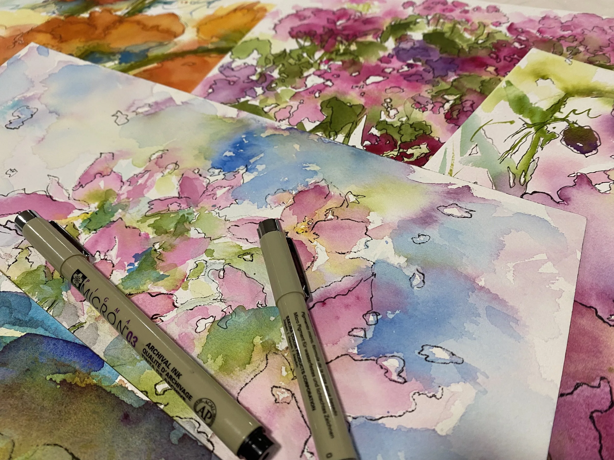 You will loosely paint using fewer details and capturing your expressive style, then add your creative personal touch to your paintings with ink pens.